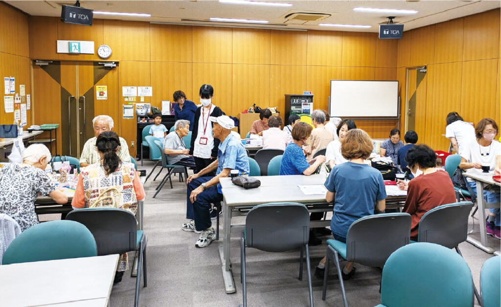 毎月1回開催している三田市の“ほっこり広野”。高齢者だけでなく、子育て中の母親と乳幼児、障害者と事業所職員、近隣の外国人らが参加する多様性豊かな多世代の交流の場です。福祉制度は、高齢者福祉、児童福祉、障害者福祉と縦割りとなりがちですが、自分たちの地域に見合った形で多世代が集う場に作り替えています。ここでは、お茶を飲む人もいれば、折り紙・手芸・囲碁・将棋など自分がしたいことに参加する人もいます。また、乳幼児の遊び相手や母親の話し相手、障害のある人との交流などの楽しみや役割も生まれています。同じ時間にフードドライブも実施しており、食品の寄付に訪れた人をおしゃべりの場に誘うなど、新たな参加者が増えるような工夫をしながら取り組んでいます。